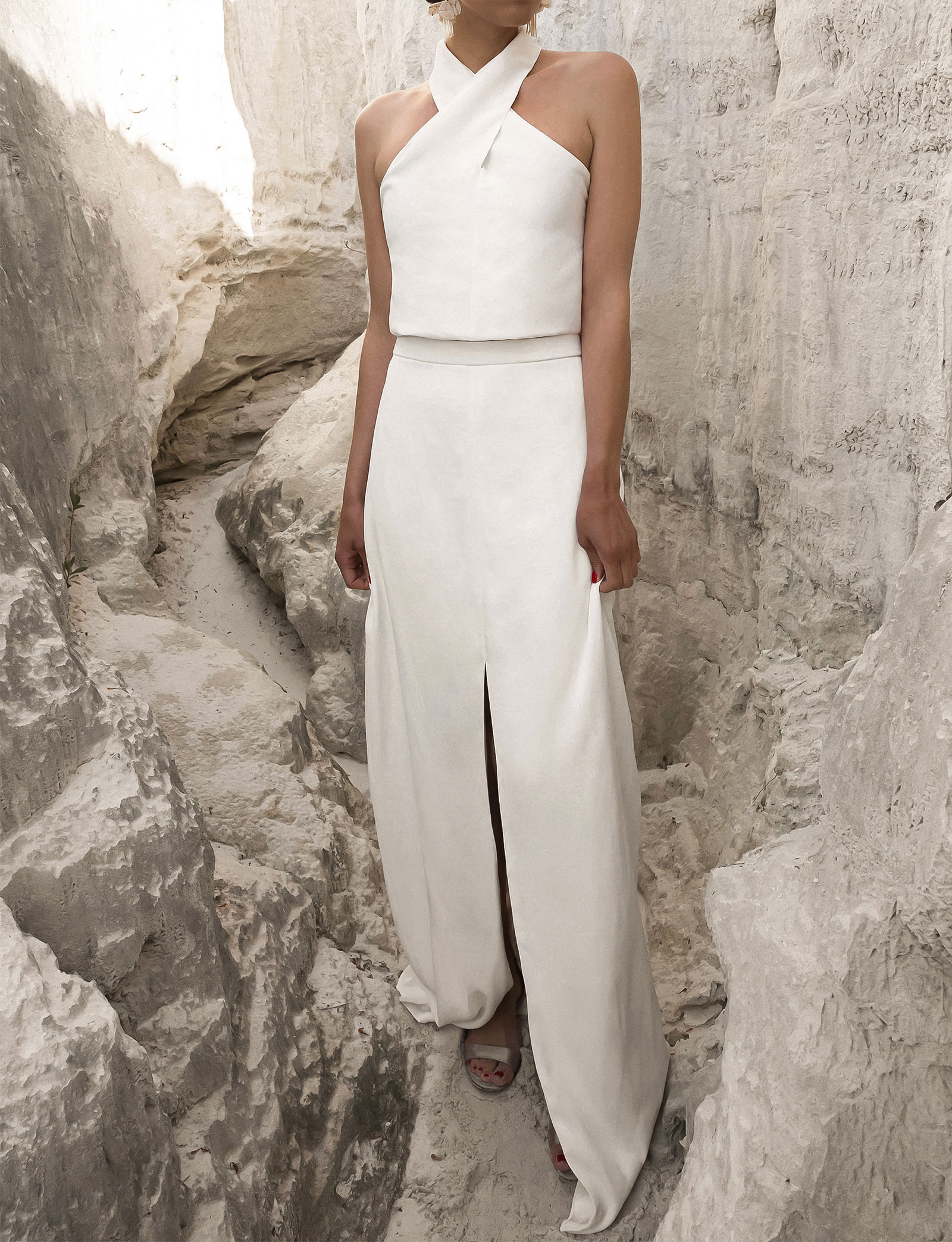 – Überkreuzter Neckholder Ausschnitt mit langen Schleifen im Rücken