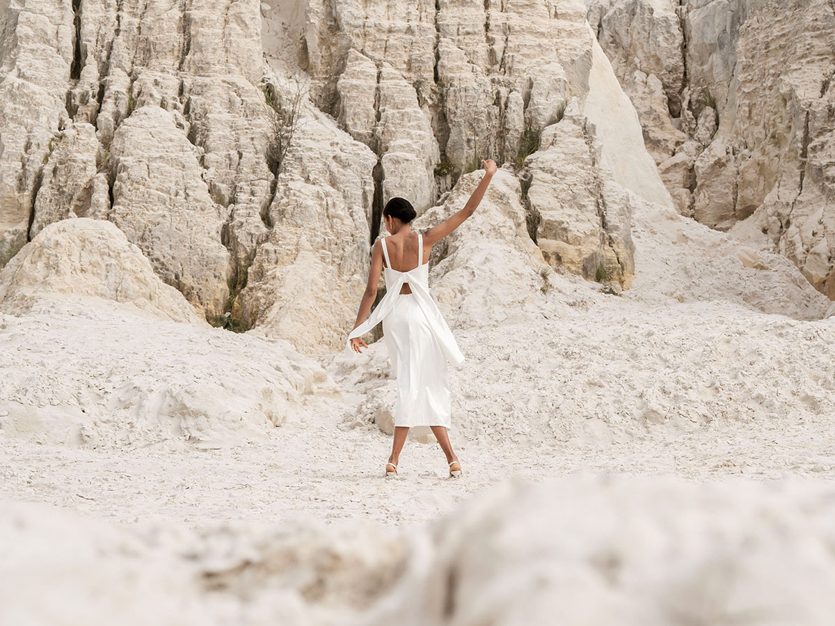 Wir glauben, dass natürliche Schönheit am besten zur Geltung kommt, wenn sie nicht von unnötigem Schnickschnack überschattet wird. Mit der Einfachheit als Leitstern haben wir uns auf subtile Details konzentriert: Scheinbar einfache Outfits, die auf den zweiten Blick mit zarten Feinheiten überraschen; Minimalistische Vorderseiten, die sich in aufwendig verzierte Rücken verwandeln, eine einfache ausgestellte Silhouette, die durch eine Vielzahl von Godets geschaffen wird, Schleifen, die als Ärmel fungieren, bodenlange Kleider, die sich in Minikleider verwandeln – die Möglichkeiten sind endlos.
