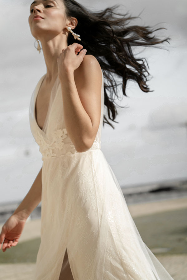 Schlichtheit bedeutet nicht Verzicht auf Sinnlichkeit. Wir haben mit dem Konzept der subtilen Sinnlichkeit gespielt, mit Schlitzen, die von Tüll bedeckt sind, mit offenen Rückenpartien, die von transparenter Seide umrahmt werden oder weit geschnittene Formen, die eine figurbetonte Silhouette darunter enthüllen. Dies haben wir mit Materialien kombiniert, die die Haut wie eine sanfte Brise umschmeicheln – weicher Tüll, transparente Chiffons, zarte Spitzen und fließende Satins.